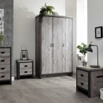 Transform your bedroom with this fabulous 4-piece furniture set. We think you’ll love the combination of Bosie’s sturdy construction with the reclaimed-effect grey finish that creates such a bold industrial look. The chunky panels – including 30mm tops – are neatly framed by the contrasting casing and accessorised by black metal handles that enhance the urban aesthetic. This set incorporates a three-door wardrobe with hanging and shelf space, four-drawer storage chest and a pair of two-drawer bedside tables.
