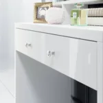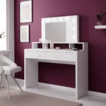 This stylish, compact vanity table is ideal for any bedroom. It includes a mirror with LED lighting and ample shelving space for cosmetics. One large drawer provides storage space for jewellery and valuables. The dressing table is made from high-quality 16mm laminated board and comes in a white gloss finish.