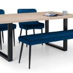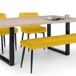 The Berwick dining table has been designed with a rustic oak finish top with emphasised natural wood grain. The industrial-style, black legs offer a stable structure that contrasts with the oak – providing a statement piece for your home. Paired with the Luxe Chairs and Bench, which are beautifully upholstered in a luxurious velvet, this set perfectly creates a contemporary aesthetic in your dining area.