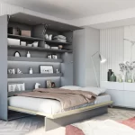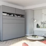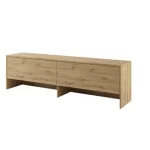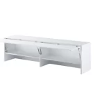 A large, spacious and practical storage unit for the horizontal wall bed. It is available in grey matt, Oak Artisan, white matt or white gloss to meet the colour requirements of the user. It features two liftable doors, each providing access to a large compartment. With its laminated board carcass, the cabinet’s structural strength and durability are ensured. Two additional open compartments are formed when placed over the bed.