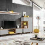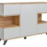The Bogota sideboard stands out with its unusual but highly functional structure. It has a 16mm laminated board carcass with a push-to-open system mechanism replacing the traditional handles system. The cabinet is very space-saving with a pair of open compartments at the sides for decorations, multiple one-compartment hinged doors and a large shelving space at the center.