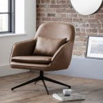 Upholstered in a brown soft faux leather fabric with a black powder coated metal base, the Bowery Swivel Chair offers a modern, industrial styling that will enhance any modern living area with an industrial touch, featuring a 360-degree swivel function. This chair excels in comfort with a sumptuous amount of padding, with an additional back pillow allowing you to relax all day.