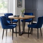 Made from solid oak, this round dining table offers a rustic finish emphasising the stunning natural wood grain. The Brooklyn Round Dining Table offers a vintage edge featuring industrial trestle style metal legs. This spacious table can seat up to 4 people, perfect for a wide range of modern decor. Accompanied by 4 Luxe Blue or Grey Dining Chairs, upholstered in a luxurious velvet fabric with contrasting black powder coated steel legs.