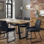 Made from solid oak, this dining table offers a rustic finish emphasising the stunning natural wood grain. The Brooklyn Dining Table offers a vintage edge featuring industrial trapeze style metal legs. This spacious table can seat up to 6 people, perfect for a wide range of modern decor. Part of the Julian Bowen Brooklyn Dining and Occasional Collection. Accompanied by 6 Soho Dining Chairs. This Retro Soho Dining Chair is finished in an antique black faux leather with a striking black metal frame, sure to compliment any contemporary décor.