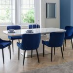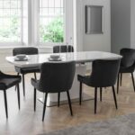 The Como extending dining table is a sleek, modern design finished in a crisp white high gloss with a sturdy chrome pedestal base. This spacious table features a butterfly extension system that is easy to use and stores within the table when not in use, comfortably seating up to 6 people. Combining a classic style with a modern twist, the Como Table is accompanied by 6 Luxe dining chair, beautifully upholstered in a grey velvet fabric with luxurious quilted detailing. Featuring contemporary black painted legs, this dining chair adds a touch of elegance to any dining area.