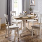 An elegant circular dining set combining an oiled real oak veneer top with a beautifully designed pedestal base, perfectly finished in a subtle ivory lacquer to ensure a classic piece with timeless appeal.