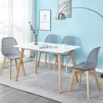 The Faye Table is a white MDF top with beech coloured rubberwood leg.