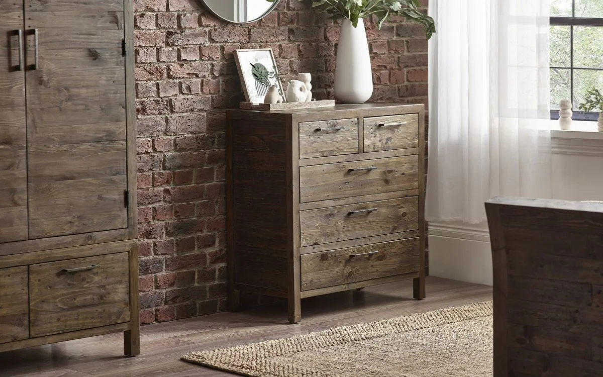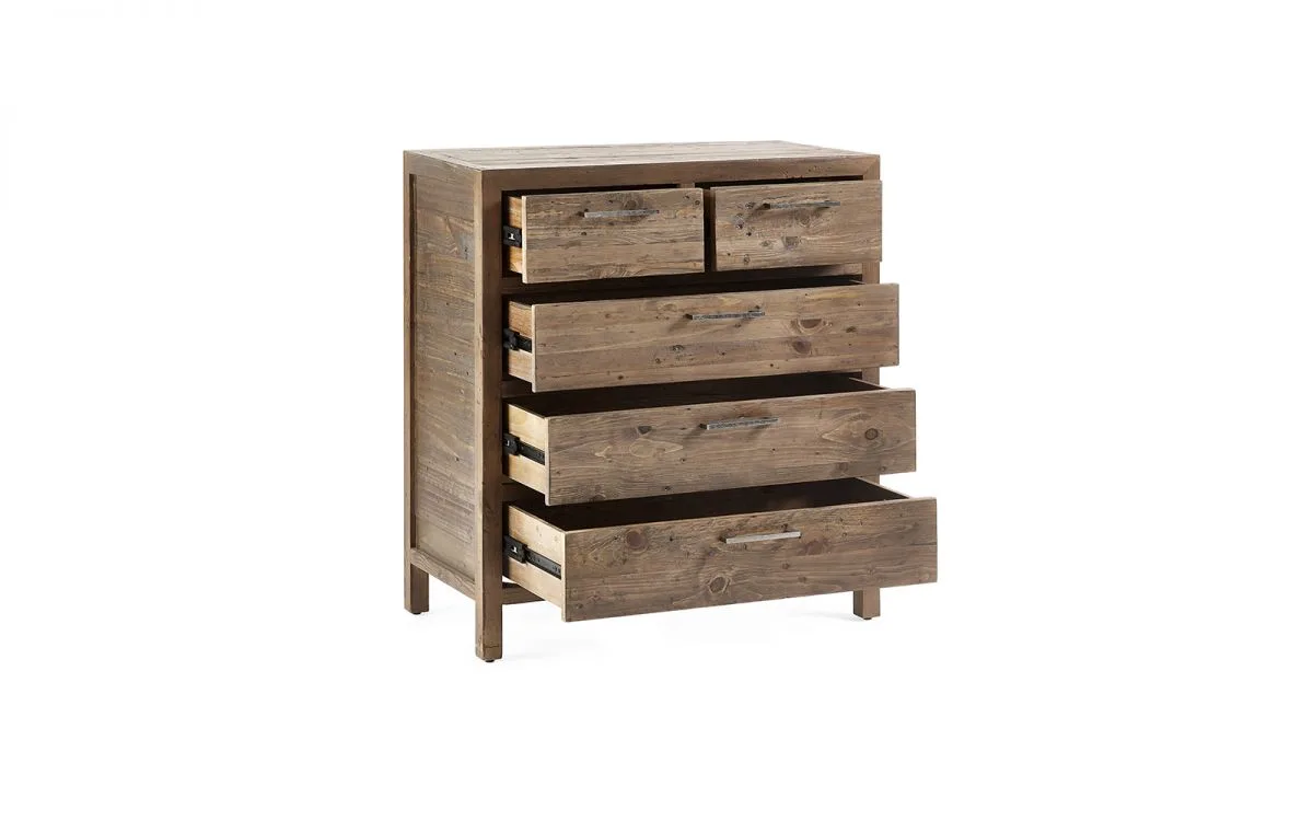 Heritage is constructed using reclaimed and recycled wood – making each piece unique and distinct. The Heritage 3+2 Drawer Chest has a distressed finish and is combined with industrial style metal handles that complete the look. The original imperfections are what make these pieces so unique and provide a distinct character in your bedroom space. With spacious drawers, this chest not only looks good, but provides the storage space you need. See the wide ranging Heritage Collection for the perfect matching pieces.