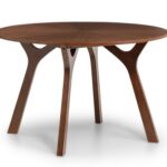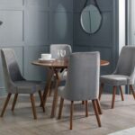 The Huxley round dining table is a contemporary design, with a traditional influence. Bringing warmth to any dining room, perfect for a mix of modern or traditional décor. Crafted from walnut veneer, this rich coloured dining table excels in stability. Accompanied by 4 Huxley Dining Chairs. The Huxley Dining Chair features a glamourous curved back, with modern tapered walnut legs. Finished in dusk grey chenille fabric, this dining chair adds a touch of elegance to any dining area