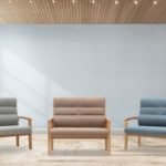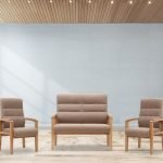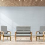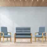 The Jacklyn Two Seater Fireside Chair is available in blue, brown or grey. It is finished in a fabric seat and back pad with a lacquered wooden frame. Also available in a set with two chairs.