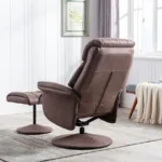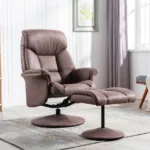 This stable chair has a push back recliner function in the back and is accompanied by a footstool.