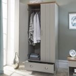 The Kenzo 2 Door 1 Drawer Wardrobe will bring a touch of country cottage chic to any bedroom. The robust frame is mounted on a proud plinth and fitted with a pair of planked-style doors, incorporating a handy drawer beneath. The piece is painted in soft grey and finished with a bevelled oak-effect top that adds a natural contrast. Accessorised with brushed steel handles, it makes an elegant choice.