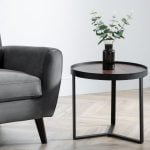 - Choose from a smoked tempered glass top and a walnut effect top that both sit beautifully upon a black metal base.