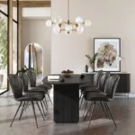 A black-finishes base elevates the sideboard with round legs to complement the round silhouette.