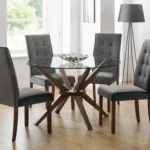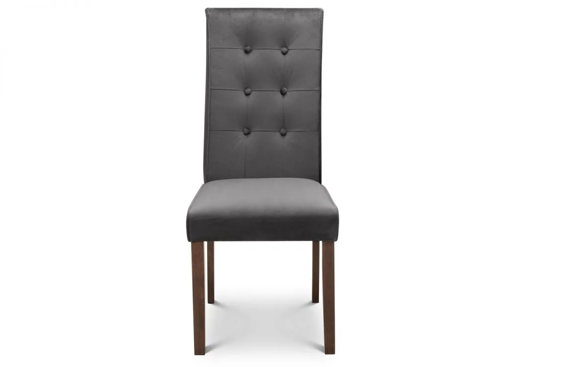 Upholstered in luxurious grey velvet, the Madrid dining chair adds a touch of class to any room. Featuring a high tufted back and walnut coloured legs, this dining chair is suitable for a variety of dining tables and décor. The perfect match for the Julian Bowen Davenport dining table.