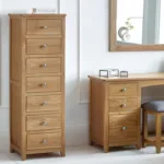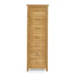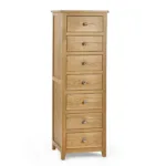Crafted from solid oak and oak veneers, the Mallory 7 Drawer Narrow Chest provides a simple and stylish storage solution for clothing and other items. Finished with beautiful round silver knobs, the chest perfectly complements any bedroom space.