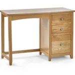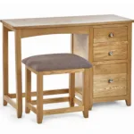 Crafted from solid oak and oak veneers this dressing table and stool set is the perfect addition to any bedroom space. Combining durability and style, with 3 generously sizes drawers providing copious amounts of storage space. Finished with round silver knobs and partnered with a comfortable and robust grey pad stool