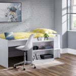 The Neptune Midsleeper offers a compact space saving design with a fresh and minimalist look in a Grey Oak or White finish, suitable in both boys and girls bedrooms. Featuring a desk and 2 large shelves, along with additional underbed storage to free up some floor space for books, toys and more. Crafted from sturdy particleboard with foil, this bed has a wooden slatted base and fits a UK single mattress
