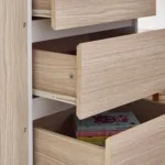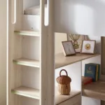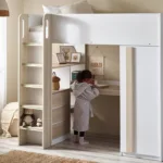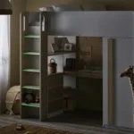 Crafted with precision and finished in a tasteful white and woodgrain effect, the Ocean Highsleeper boasts a versatile design that maximises every inch of space. This highsleeper features a practical desk which provides a dedicated workspace for homework or creative endeavours, with three convenient pull-out storage drawers that prevent cluttering and keeps essential items within arms reach. The built-in shelving units are ideal for showcasing items or organising books, and the one-door wardrobe offers a discreet and space-efficient solution for clothes. The glow-in-the-dark steps are a perfect addition – not only do they add a playful touch, but they enhance visibility during the night for your younger ones.