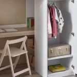 - Features a desk, three pull-out storage drawers, a one-door wardrobe, and built-in shelving units