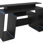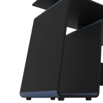 The base of the desk features a computer store away along with a shelf for games, controllers, or paperwork. This modern looking gaming computer desk is finished with a stunning ergonomic curved dark blue trim making it a stunning addition to any home or office.