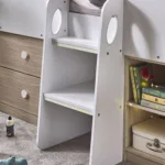 Transform bedtime into a magical adventure with the Orpheus Midsleeper, a delightful house-style bed designed to capture the imagination of your little ones. Finished in a charming woodgrain and white, this enchanting bed features two pull-out drawers and open shelving, creating ample space for toys and necessities. The two-step study glow-in-the-dark ladder adds a playful touch, leading to the cosy haven on top complete with a wonderful roof and two opened windows on each side. Give your child the perfect dream bed they’ve always imagined.