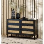 Fusing modern construction with retro design elements, the Padstow collection will exquisitely complement any styled home. The natural rattan fronts and industrial-style base collaborate perfectly to leave a warm yet chic aesthetic in your home. This range includes a bedside, 3 drawer chest, 6 drawer chest, wardrobe, coffee table, TV unit, sideboard, and tall bookcase. Also available in a black finish.