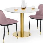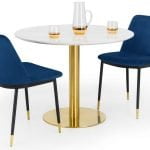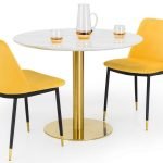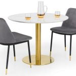 The Palermo round pedestal table is a contemporary, modern, and sleek piece which will complete your dining experience. With an easy-to-wipe, crisp marble top and sturdy gold base, it oozes sophistication whilst being functional and classic. Whether you’re having drinks with a friend, or a relaxed lunch with your loved ones, the Palermo is a beautiful addition to any home. Featured with 2 Delaunay Mustard Chairs.