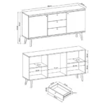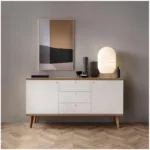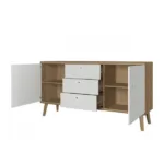 This elegant sideboard cabinet will undoubtedly impress with its high-quality craftsmanship and sleek, modern design. Finished in white matt with Oak Riviera, it is the perfect piece of furniture to enhance any modern or contemporary decor. It features two hinged doors, three drawers and a pair of removable shelves for storage.
