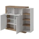A modern sideboard cabinet with a high-quality finish and versatile storage options, the Sintra is the perfect piece that will complete any interior. Finished in white matt, it has an Oak Sandal veneer and a handle-free structure for added elegance. It features four open compartments and a total of eight covert compartments behind two hinged and two drop-down doors. The Sintra 45 is made from 16mm laminated board.
