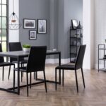 Simplistic in design with a contemporary style, the Staten dining table will add a stunning industrial look to any living and dining area. Constructed from a black coated metal frame, complemented by a striking concrete effect tops, to create a very stylish, modern product. Featured with 4 Jazz black dining chairs. Our modern styled Jazz chair has great comfort and stacks away for compact storage. Crafted from a steel frame with foam and fabric upholstery, providing you maximum comfort and durability.