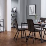 Simplistic in design with a contemporary style, the Staten Dining Table will add a stunning industrial look to any living and dining area. Constructed from a black coated metal frame, complemented by a striking concrete effect tops, to create a very stylish, modern product. Featured with 4 Monroe dining chairs. The Monroe dining chair combines a retro flair with a contemporary design, perfect for the modern home. Upholstered in a charcoal grey microsuede fabric, with powder coated steel legs, this sturdy design offers a modern, neutral design perfect for a range of décor.
